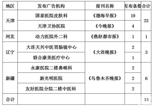 其中天津发布虚假违法中医医疗广告情况较为严重,国泰医院皮肤科在《渤海早报》发布19条次,天津卫协医院在《今晚报》发布4条次。河北省的动力医院外二科在《燕赵都市报》发布1条次。辽宁省的大连天兴中医胃肠镜中心和联合康美医疗中心在《大连晚报》分别发布2条次、1条次。新疆维吾尔自治区的永康医院二楼鼻喉科、新光明医院、友好医院分院二楼中医科在《乌鲁木齐晚报》各发布2条次。具体名单见下: